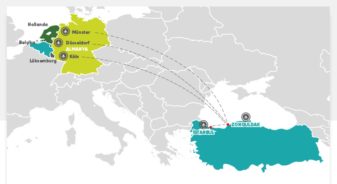 Located in Çaycuma district of Zonguldak, Zonguldak Airport has the status of an international airport and is a regional airport serving the provinces of Zonguldak, Karabük and Bartın. From Zonguldak Airport, reciprocal flights are operated to Düsseldorf, Cologne and Münster cities of Germany for international flights and to Istanbul Airport for domestic flights.
