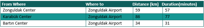 Distances of Zonguldak Airport to TR81 West Black Sea City Centers