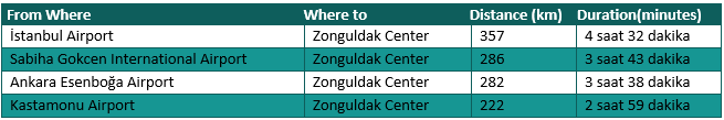 Among the airports used for transportation to Zonguldak are Istanbul Airport, Sabiha Gökçen Airport, Ankara Esenboğa Airport and Kastamonu Airport.